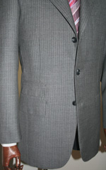 美しいイングリッシュ・ドレープ3シーズン用の生地として、軽やかな色のグレーにペンシルストライプが入った生地を、お客さまは一目で選択されました。それほど薄い生地ではありませんが、さらっとした感触と清涼感がありますので暑い時期にも軽快な着心地を得られると思います。